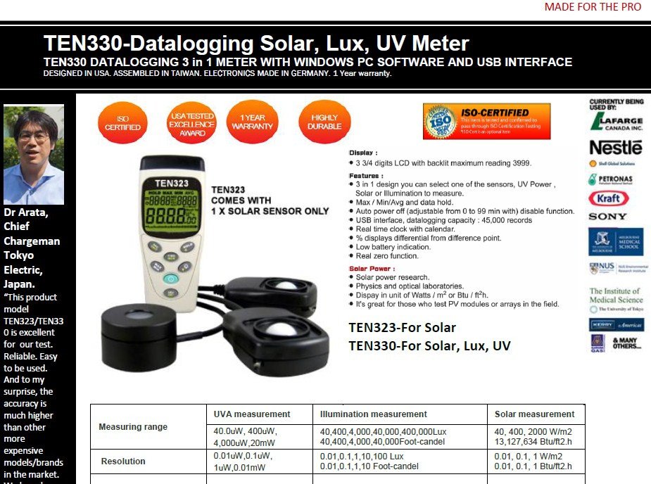 TEN330- DATALOGGING SOLAR, UVA & LIGHT METER (3 IN 1) COMES WITH DATALOGGING FUNCTION